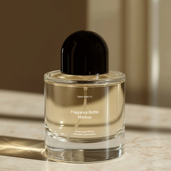 This mockup highlights a modern, curved fragrance bottle placed in warm, directional sunlight for a soft, luminous glow. The glistening reflections and marble-textured surface create a refined, editorial atmosphere—ideal for premium fragrance, beauty, and lifestyle branding that requires an elevated, aspirational feel.