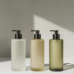 This mockup showcases a trio of modern, frosted cosmetic bottles placed in warm, directional sunlight for a soft, luminous glow. The subtle colour variations, realistic shadows, and minimal concrete backdrop create a refined, editorial atmosphere—ideal for premium skincare, beauty, and lifestyle branding that requires an elevated, aspirational feel.